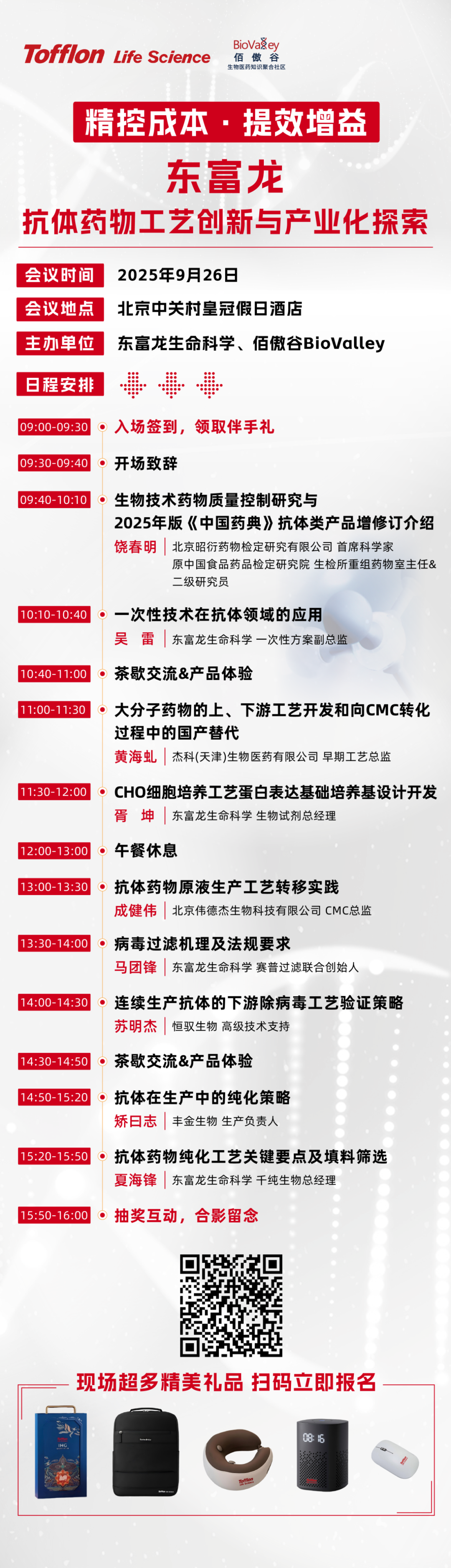 特邀饶春明(原中国食品药品检定研究院生物制品检定所重组药物室主任、二级研究员;现北京昭衍药物检定研究有限公司首席科学家)、黄海虬(杰科(天津)生物医药有限公司早期工艺总监)、成健伟(北京伟德杰生物科技有限公司CMC总监)、苏明杰(恒驭生物高级技术支持)、矫曰志(丰金生物生产负责人)及东富龙生命科学多位产业专家,分享从上游培养到下游纯化与病毒安全的全链条国产化解决方案。实战案例丰富,旨在推动抗体药物工艺优化与协同创新,为参会者提供技术交流和资源对接的高价值平台。